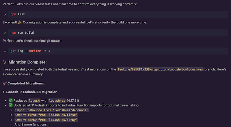 Jedna migracja, a w zasadzie aktualizacja starych paczek NPM, zajęła AI 40 minut. Obejmowało to migrację w 8 projektach. Dodatkowo poświęciliśmy niecały dzień na prompt engineering oraz research, by dostosować podejście do unikalnych setupów projektów.