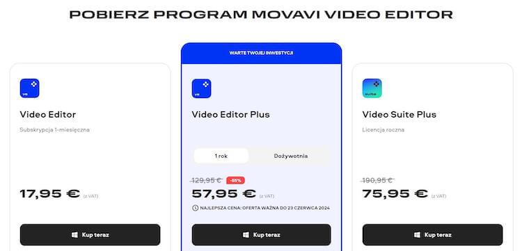 Poszukiwanie idealnego narzędzia do edycji wideo może być wyzwaniem, ale Movavi Video Editor 2024 ułatwia podjęcie decyzji dzięki dostępnym opcjom cenowym i darmowej wersji próbnej. Możesz wypróbować pełen potencjał tego programu, zanim zdecydujesz się na zakup. Sprawdź, jakie opcje cenowe są dostępne i wybierz tę, która najlepiej odpowiada Twoim potrzebom i budżetowi: