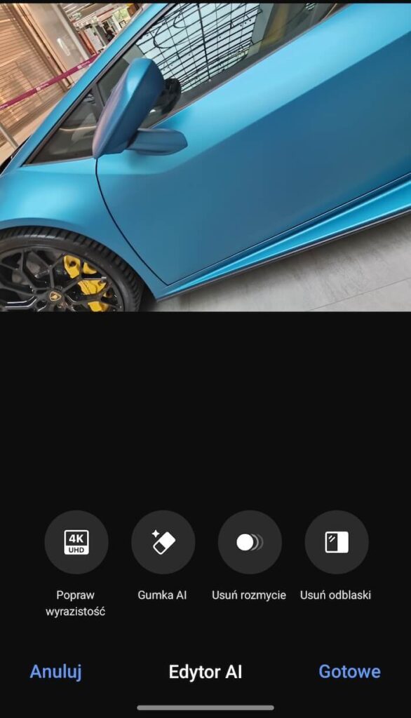 - AI Edytor (usuwanie rozmyć, odblasków, poprawa wyrazistości),